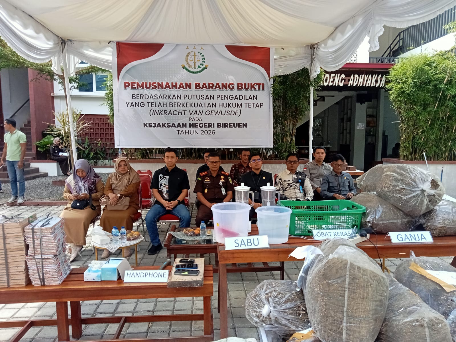 ms-bireuen.go.id | Bireuen – Selasa, 10 Februari 2026, Ketua Mahkamah Syar’iyah Bireuen yang diwakili oleh Hakim Bapak Ibnu Rusydi, Lc., M.H., menghadiri kegiatan Pemusnahan Barang Bukti yang Telah Berkekuatan Hukum Tetap. Kegiatan tersebut dilaksanakan di halaman Kantor Kejaksaan Negeri Bireuen dan dihadiri oleh unsur Forkopimda serta instansi terkait lainnya sebagai bentuk sinergi antar aparat penegak hukum.